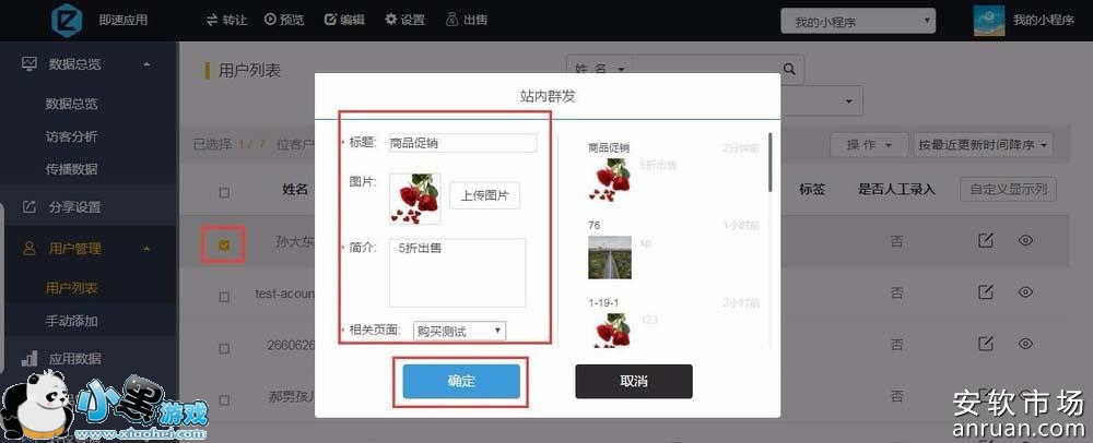 4、举例,勾选一个用户,编辑如下发送内容,相关页面选择购买测试。点击确定即可发送消息。注:此处购买测试使用了商品列表