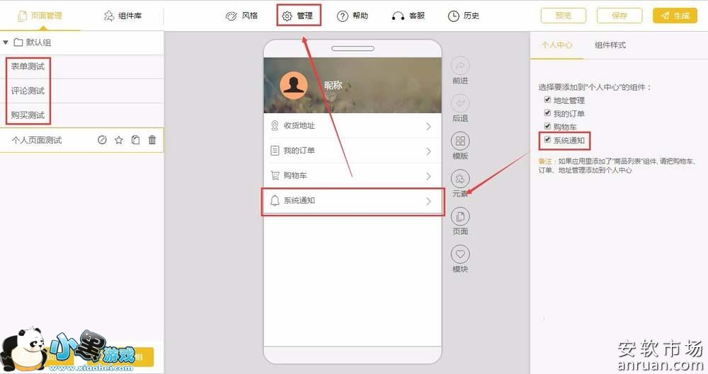1、添加个人中心组件,右侧勾选系统通知,点击管理进入后台。个人中心组件使用说明