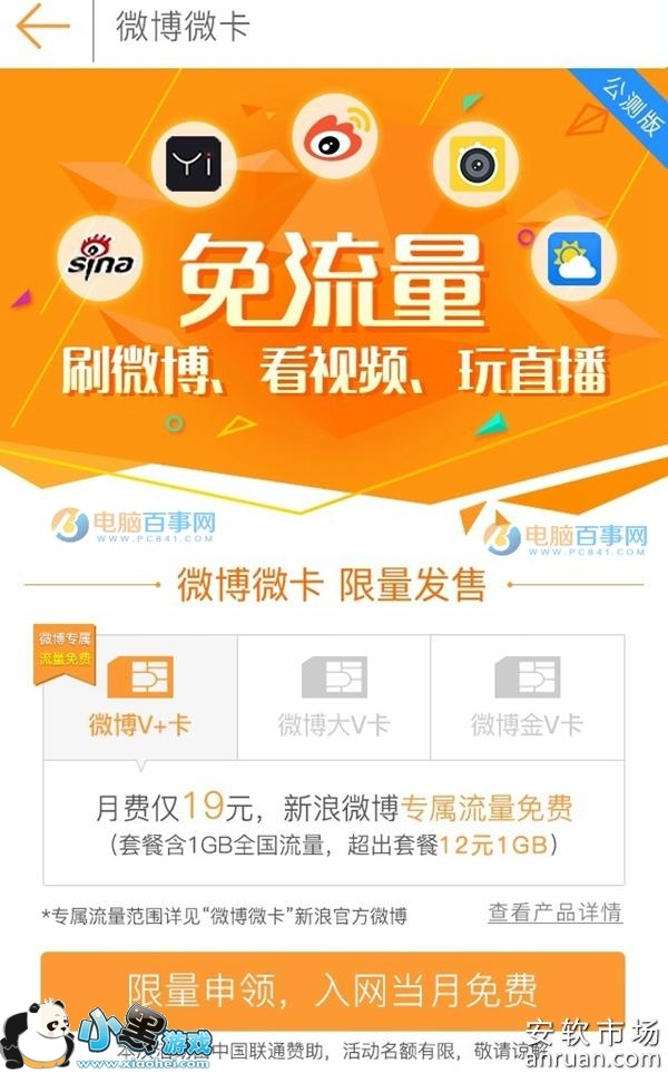 3月初,联通和新浪微博推出的手机卡名为微博微卡,分为“大V卡”和“V卡”两个版本,他们最大的特色就是访问新浪微博可以免流量。不过,遗憾的是,无论微博V卡还是微博大V卡,其套餐内容都比较一般般,诱惑力不大,直到微博金V卡的出现。