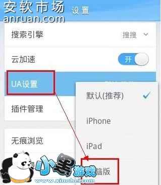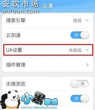 4在设置界面,找到“UA(浏览器标识)设置”并点击以选择其他选项,在列表项中将浏览器UA设置为“电脑版”。