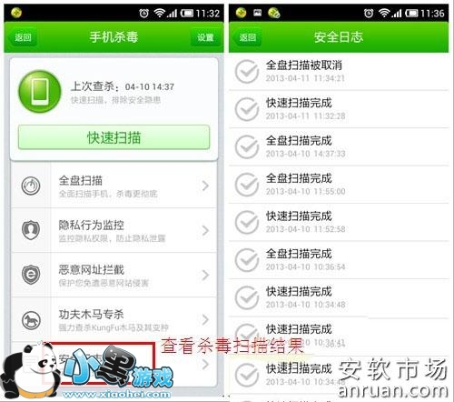 ⑤在手机杀毒的功能中,还有一个“安全日志”的功能,点击“安全日志”,这里记录杀毒扫描的操作结果。