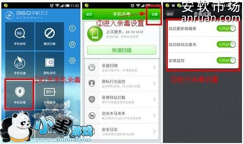 ①点击“手机杀毒”打开杀毒功能,②点击右上角的“设置”功能,③进行杀毒设置,可以自动更新病毒库、自动联网查杀、安装监控等等。