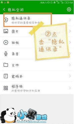 2.进入到隐私空间之后你会看到如图所示的,隐私通讯录,点开它。点开之后,在右上角,找到【更多】,点击更多,如图。