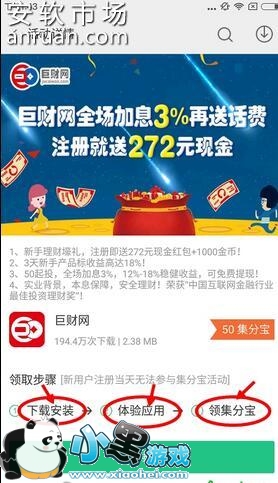 4、在“集分宝”活动页面中任意挑选一个应用,点击进入下载页面。在此页面中大家可以看到。有三个领取步骤:“下载安装-体验应用-领集分宝”。一定要按照这个步骤一步一步来,那么第一步我们就点击“下载”按钮。