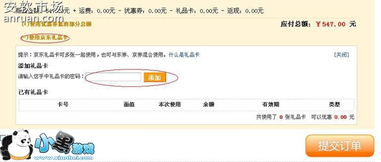 京东卡/京东E卡是在订单结算的时候使用的,在支付方式的地方选中任意支付方式保存,在提交订单按钮的上方,会显示使用京东卡/京东E卡。点击选择,手动输入卡号、密码后点击添加,就可以使用了。具体使用方法请看下图: