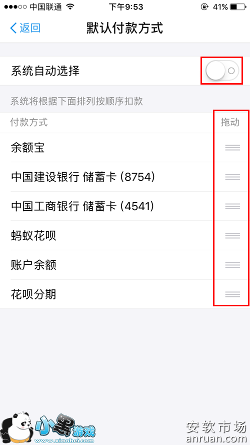 4、最后即可设置默认的付款方式,比如可以开启系统自动选择付款方式,也可以关闭手动设置扣款顺序,可以拖动进行顺序调整哦,如图所示。