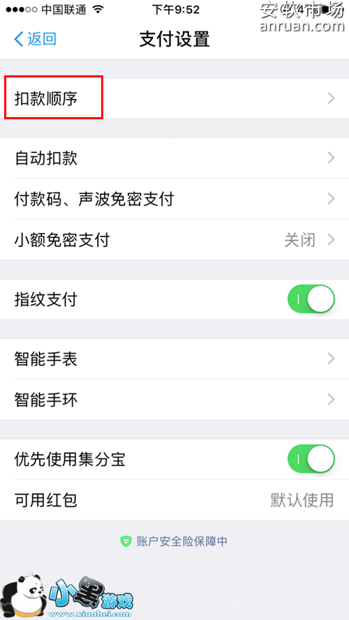 3、随后在支付设置界面下方点击进入【扣款顺序】一栏,如图所示。