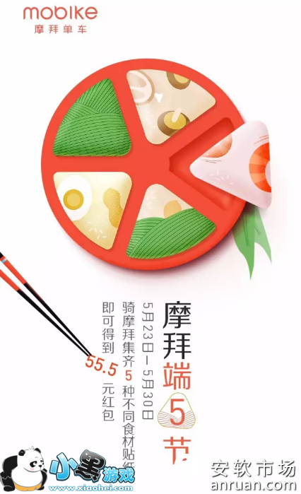 骑摩拜集齐5种不同食材贴纸即可得到55.5元红包
