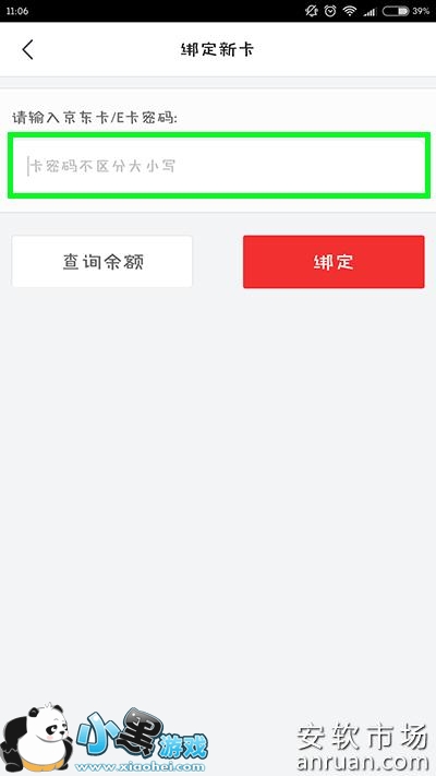 第四步:刮开你的京东E卡上的图层,将密码输入下方标记的方框中,点击绑定。