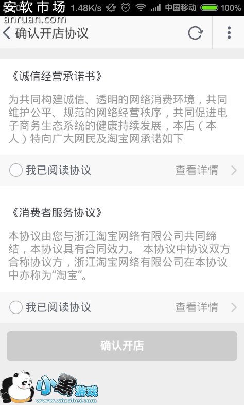 4如果你以前没有开过淘宝店铺的话,点击界面中出现的相关协议页面,然后选择“我已同意阅读协议”,然后点击界面最下方的“确认开店”按钮。