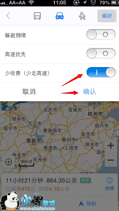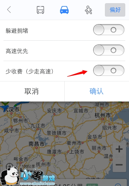 2)在界面点击【偏好】,点击开启【少收费、少走高速】,最后点击【确定】即可。(如下图)