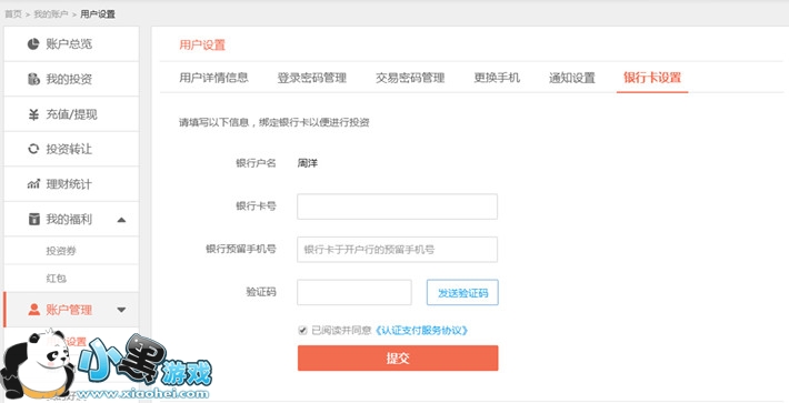 1、登录惠金所官网--【我的账户】--【账户管理】--【用户设置】-【银行卡设置】
