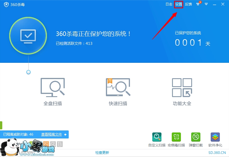 1.打开360杀毒软件,在右上角点击‘设置’。