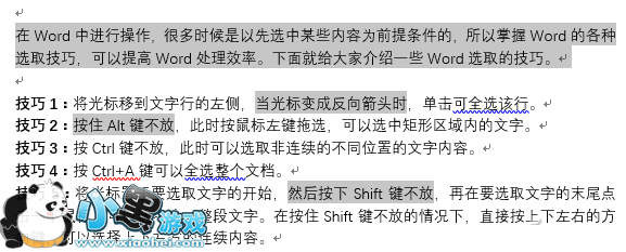 技巧3:将光标置于要选取文字的开始,然后按下Shift键不放,再在要选取文字的末尾点击一下鼠标,可以选中这一整段文字。在按住Shift键不放的情况下,直接按上下左右的方向键,可以选择上下左右的连续内容。