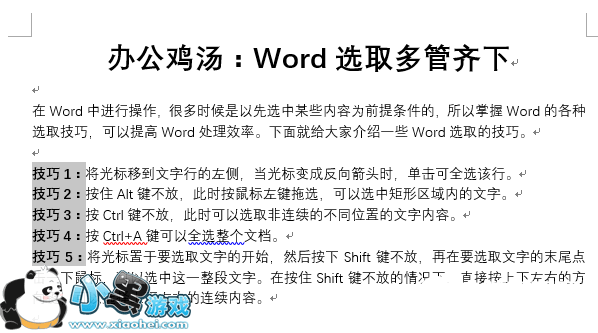 技巧1:将光标移到文字行的左侧,当光标变成反向箭头时,单击可全选该行,双击则全选该段,三连击则全选整个文档。