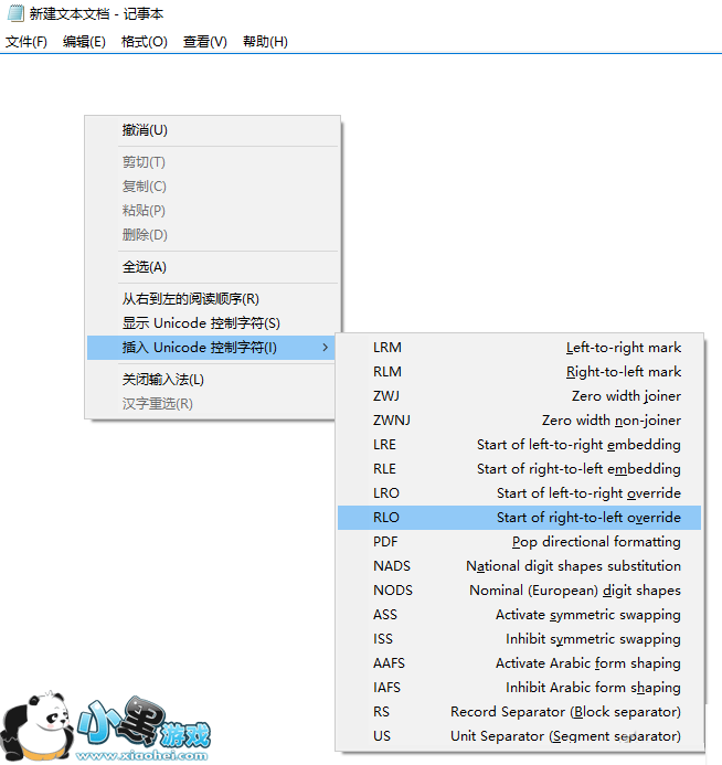 随便找个地方新建个文本文档(.txt),0用“记事本”打开它(必须是Windows自带的记事本)。在文档的空白地方点鼠标右键,选择“插入Unicode控制字符-RLO Start of right-to-left override”,相似的英文有好几个,别选错了。