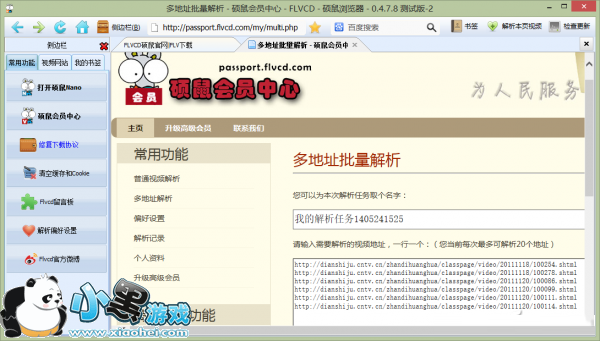打开硕鼠下载工具,点击左侧“常用功能→硕鼠会员中心”,在会员中心窗口中点击“多地址解析”链接,将上面获得的播放地址列表复制到解析地址窗口,然后点击“开始解析”按钮(图4)。