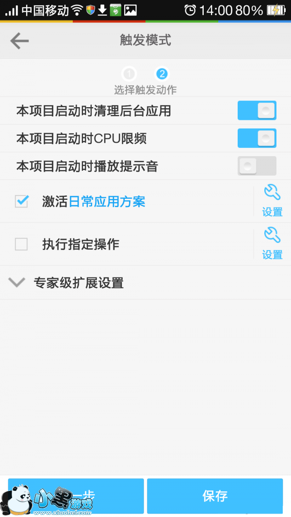 包括“LBE安全大师”(下载地址:http://www.lbesec.com/)在内的很多客户端软件都提供了高级电源管理功能。以LBE为例,我们可以手动添加触发条件(图1),比如当屏幕熄灭时自动清理内存、CPU降频(图2)。此外,还可以根据时间段设定不同的功能开关状态,比如晚上23点后自动关闭网络、CPU降频、静音、关闭触感等等。
