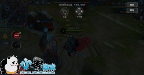 然后在这里设置自己的键位,将上方十字键拖到左下角位置,将点击键拖到每一个需要操作的地方,然后分别设置键位。我的推荐是方向键使用WASD,技能之类是JKLUIO,空格是购买物品,这样子就有搓拳皇的感觉了,嘿嘿。