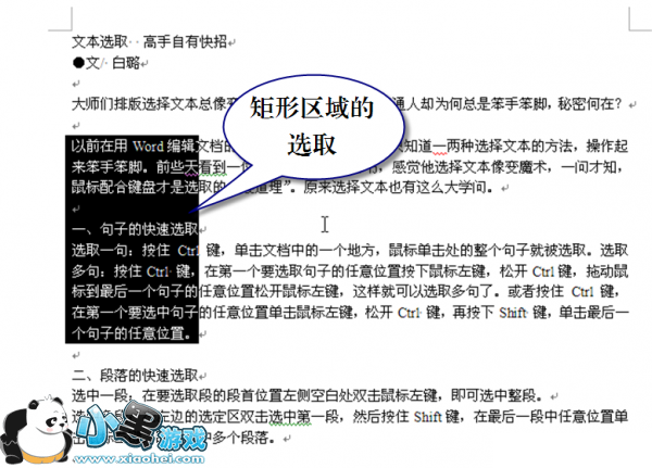 通常我们只关心选择几个词语、句子或段落。特殊情况下,我们还可能要选择矩形区域。矩形选取的方式有以下3种: