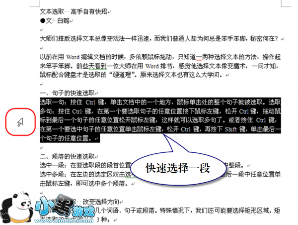 选中多段:在左边的选定区双击选中第一段,然后按住Shift键,在最后一段中任意位置单击鼠标左键,即可选中多个段落。
