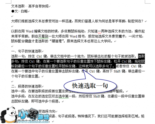 选取一句:按住Ctrl键,单击文档中的一个地方,鼠标单击处的整个句子就被选取。选取多句:按住Ctrl 键,在第一个要选取句子的任意位置按下鼠标左键,松开Ctrl键,拖动鼠标到最后一个句子的任意位置松开鼠标左键,这样就可以选取多句了。或者按住Ctrl键,在第一个要选中句子的任意位置单击鼠标左键,松开Ctrl 键,再按下Shift 键,单击最后一个句子的任意位置。