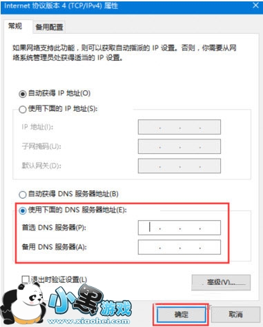 1、打开本地连接和WLAN连接(无线网用户)的IPv4的属性页面,并选择手动添加DNS服务器地址(不会的话百度“修改dns方法”即可)