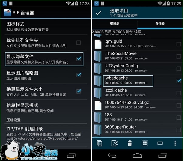 由于“.wbadcache”文件夹是个隐藏文件夹(名称前带“.”的均为隐藏文件),所以要在R.E.管理器的设置中,勾选上“显示隐藏文件”。