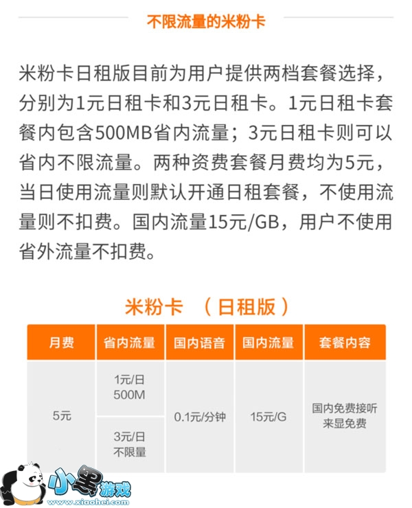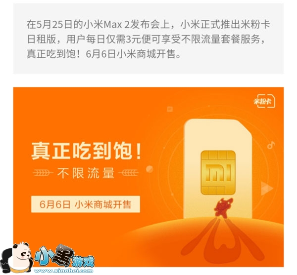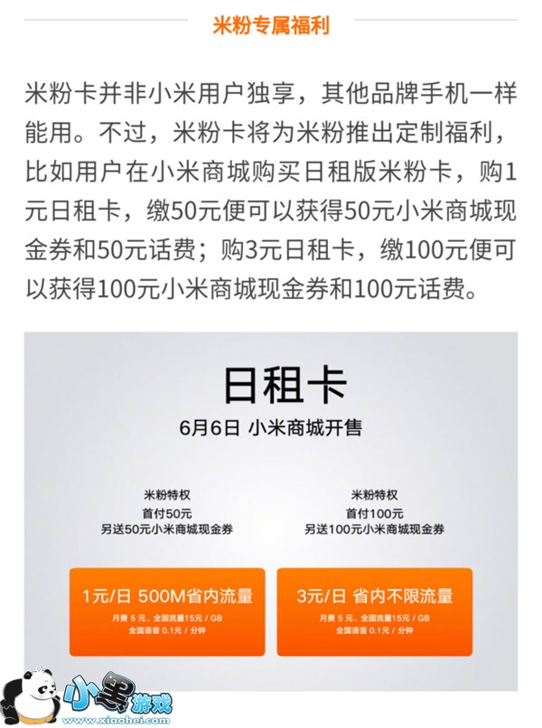 2017年6月6号小米正式发布了米粉卡日租卡,此套餐只要5元月租,分为两个版,一是针对用流量少的用户每天一元500兆省内流量日租卡可叠加,还有就是3元省内不限流量使用日租卡,流量不用不掏钱。