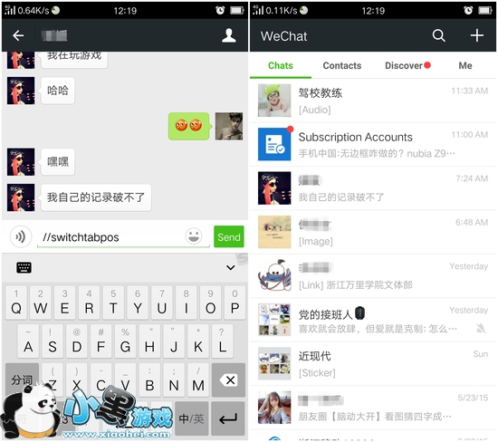 让微信底栏动起来,更贴合 Android Design。 Android与IOS最不一样的地方,莫过于一个标签栏在下一个标签栏在上了。实话说,Android版微信的界面设计并不出彩,而且相当没有Android味!“//switchtabpos”这段代码的最大用处,就是将Tab栏由之前的下方挪至上方,于是原本还透着浓浓IOS味的UI瞬间就有了Android范。最关键的是,这还是一条开关码,什么时候用腻了,再输入一遍,立马就能还原回之前的样子。