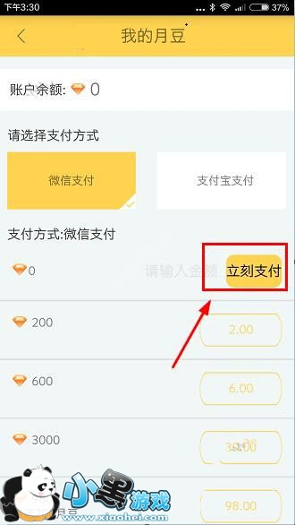 2、接着在【我的月豆】页面,选择需要充值的金额信息后,点击【立即支付】按钮即可充值成功哦。