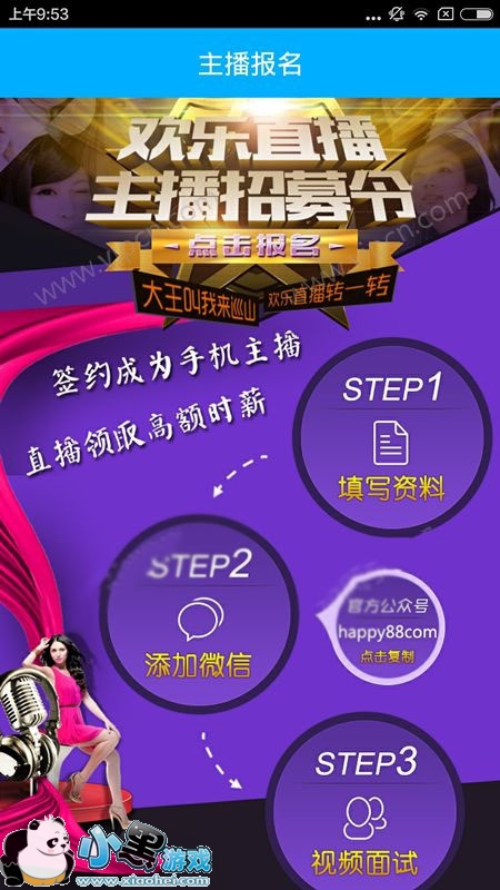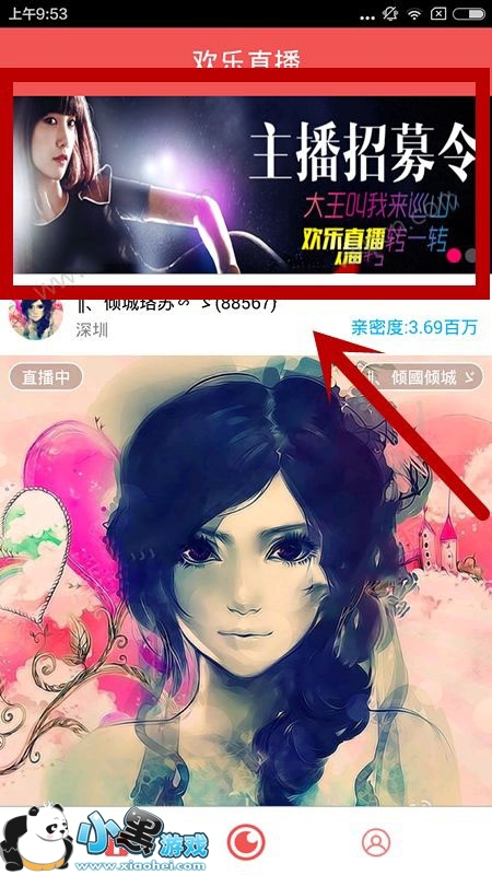 1、打开欢乐直播app,在首页上方就可以看到“主播招募令”点击进入;