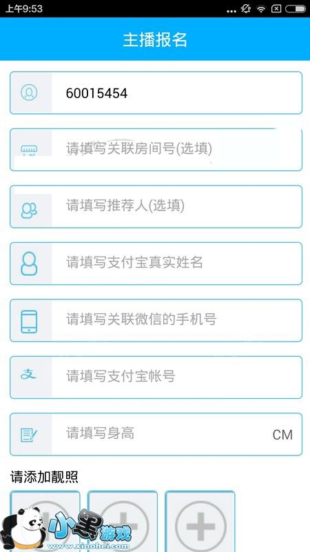 3、在“主播报名”页面用户需要填写关联房间号、推荐人、支付宝真实姓名、手机号等等内容并上传自己的正面清晰照,注意所有信息都要填写真实的才有助于审核通过,全部资料填写完毕后点击下方的“提交”就能够申请成功了,提交完毕之后耐心等待审核通过就ok了哦!