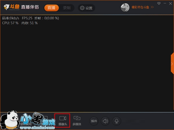 1、打开斗鱼直播伴侣这款软件,在斗鱼直播伴侣主界面的下方,可以看到“选择游戏”、“窗口截取”、“手游直播”、“摄像头”、“多媒体”等功能按钮,点击其中的“摄像头”按钮,即可进入“摄像头设置”界面;