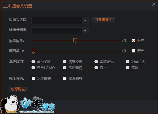2、在“摄像头设置”界面中,大家可以进行“摄像头选择”、“输出分辨率”、“瘦脸瘦身(最高50)”、“画面美白(最高255)”、“选择滤镜(美白柔肤、清新淡雅、暖暖阳光、甜美可人、经典LOMO、紫色迷情、复古、蓝调)”、“镜头方向(水平翻转、垂直翻转)”几个方面的设置。对摄像头进行设置之后,主播们都可以变得美美哒、帅帅哒,是不是很棒呢?!