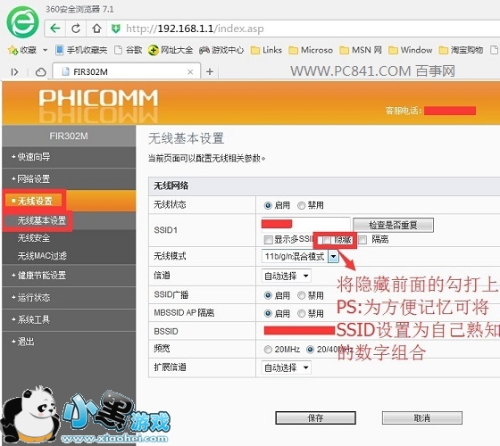 第二步:成功登陆路由器后台管理设置界面后,找到无线设置,然后将“开启无线广播(有些显示为SSID)”前面的勾去掉 点击保存即可,如图。