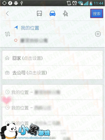 【第一步】首先在“路线”选项中定位【我的位置】和【目的地位置】,然后点击【搜索】。