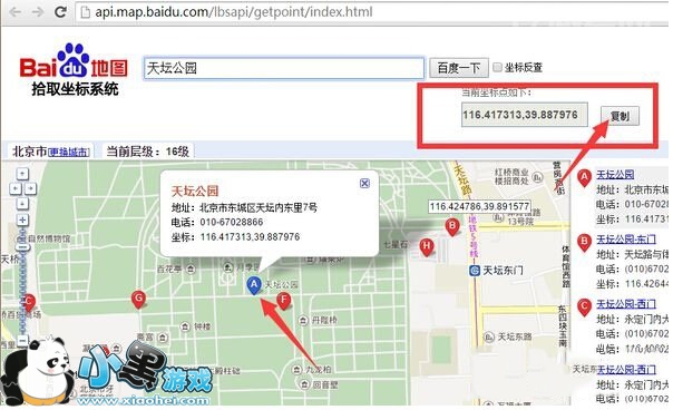 输入“天坛公园”,然后“百度一下”。在点击坐标右边的“复制”按钮就可以了。