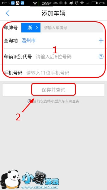 3、输入车辆相关信息,点击【保存并查询】(以后查询就不需要再次输入了)