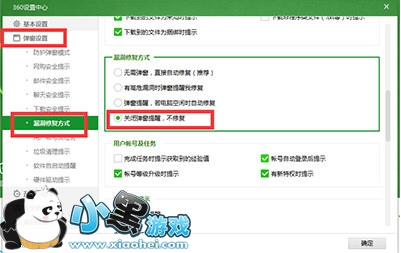4、将默认设置:无需提醒,直接自动修复,改成自己需要的方式,如:关闭安全提醒,不修复!