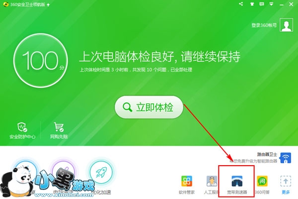 1、首先哦们打开360安全卫士,然后我们点击“宽带测试器”。