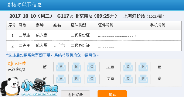 2.如不选择座席关系,直接点击“确定”,系统将自动为您分配席位。