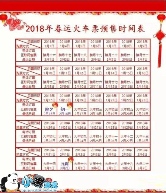 2018春运火车票预售时间表: