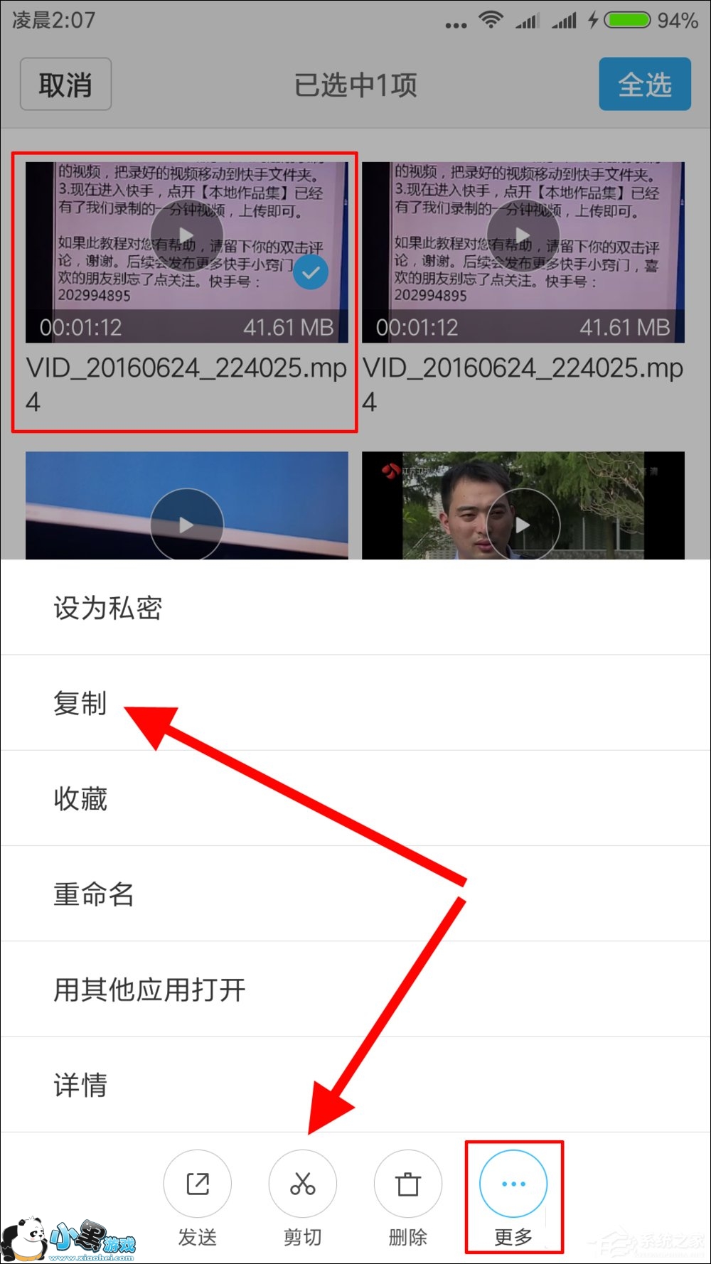 3、长按找到的视频,点击底部【更多】选项,选择【复制】或者【剪切】都可以。