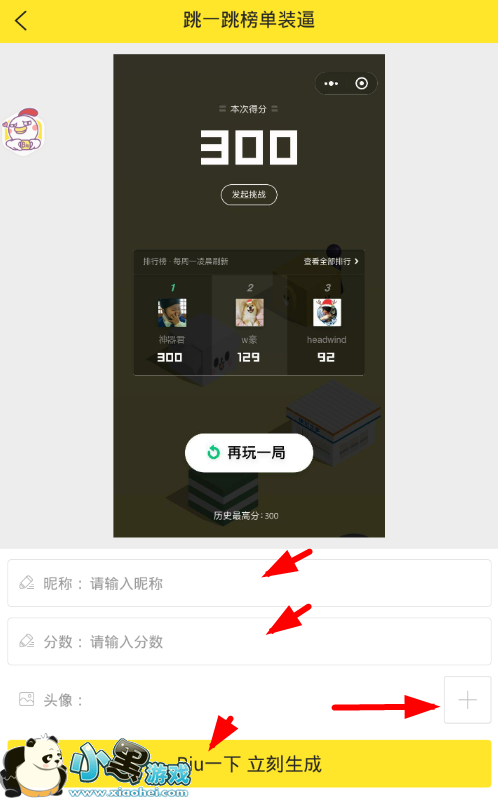 3、接着通过输入自己的“昵称”和“分数”,上传自己的头像。点击下方的“Biu一下”选项,就能够直接完成P图了。
