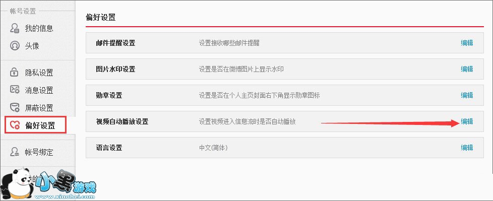 2、在我的信息页面,点击左侧中的“偏好设置”,在右侧找到“视频自动播放设置”,点击后方“编辑”,如图:
