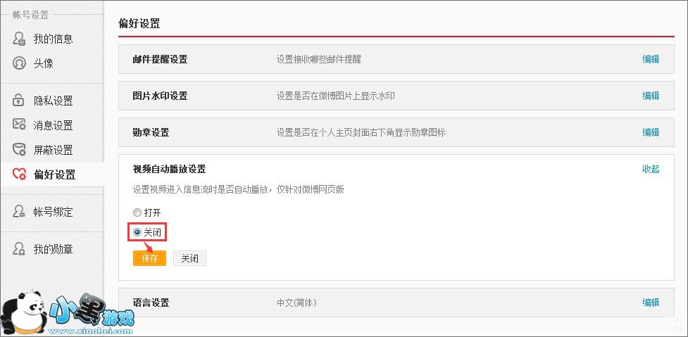 3、将视频自动播放设置下面,选项选择【关闭】,然后点击【保存】按钮保存设置即可!