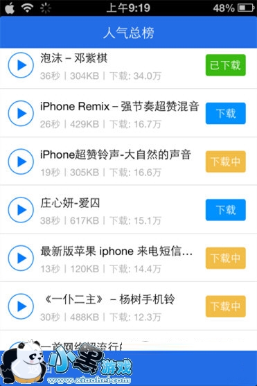 3、找到铃声之后,点击歌曲即可试听;点击蓝色“下载”按钮即自动进行下载,支持同时下载多首铃声(建议在WiFi环境下进行下载)。