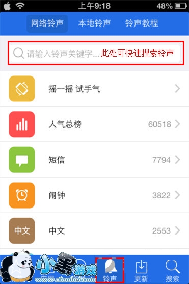 2、打开手机端爱思助手,点击下方“铃声”,可以根据铃声类别选择下载,也可点击上方搜索栏快速搜索铃声。