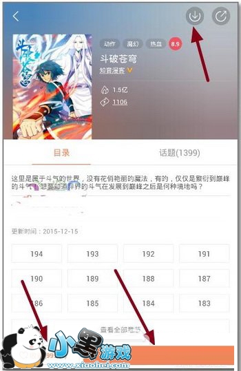 找到自己喜欢的漫画之后,点击进入可以看到目录更新到哪些了,若觉得满意则可以收藏,并点击右上角下载这个漫画。